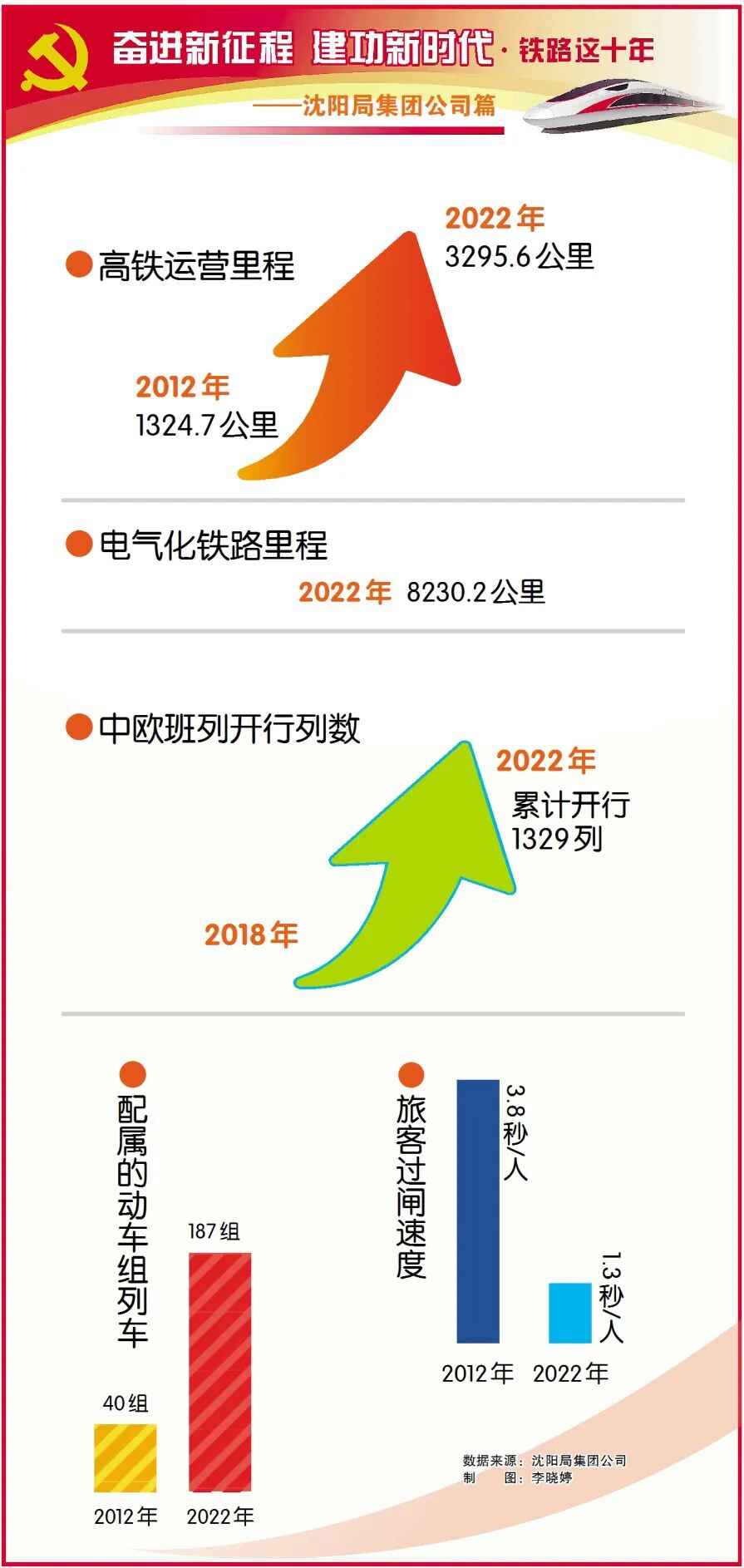 党的十八大以来,中国铁路沈阳局集团有限公司以习近平新时代中国特色社会主义思想为指导,坚持新发展理念,主动作为、奋发有为,用实际行动担负起交通强国铁路先行使命担当,为加快推动铁路建设向更高水平迈进奠定坚实基础。