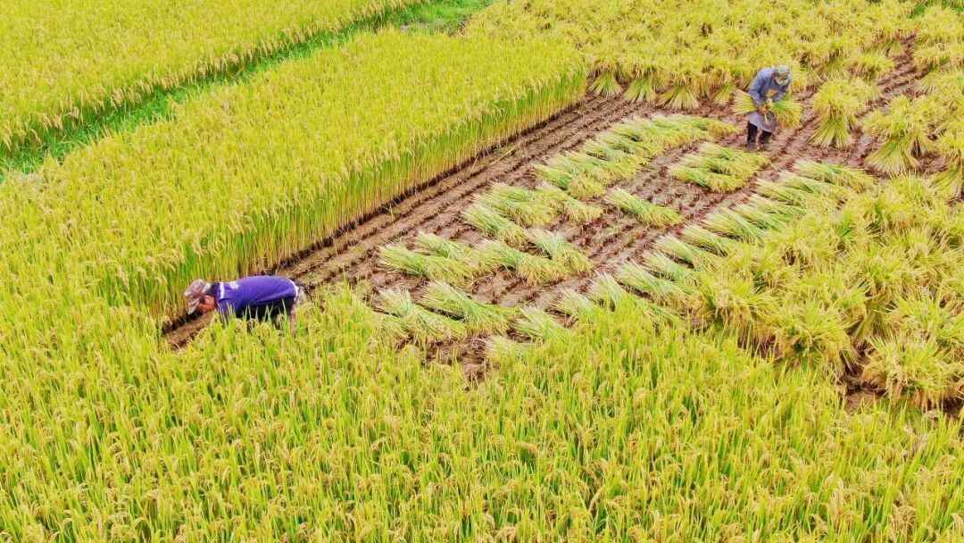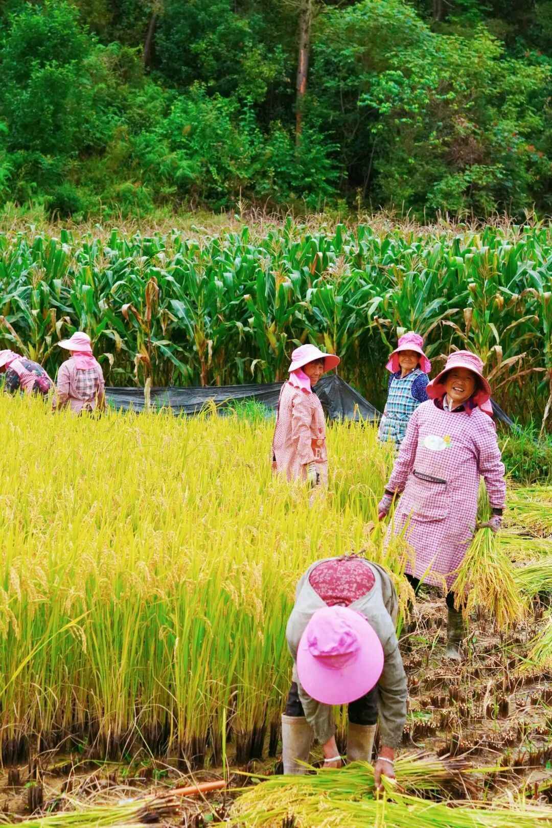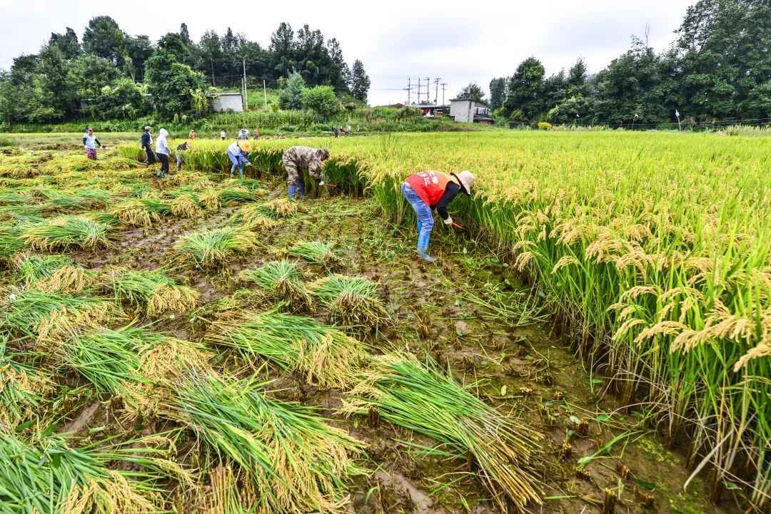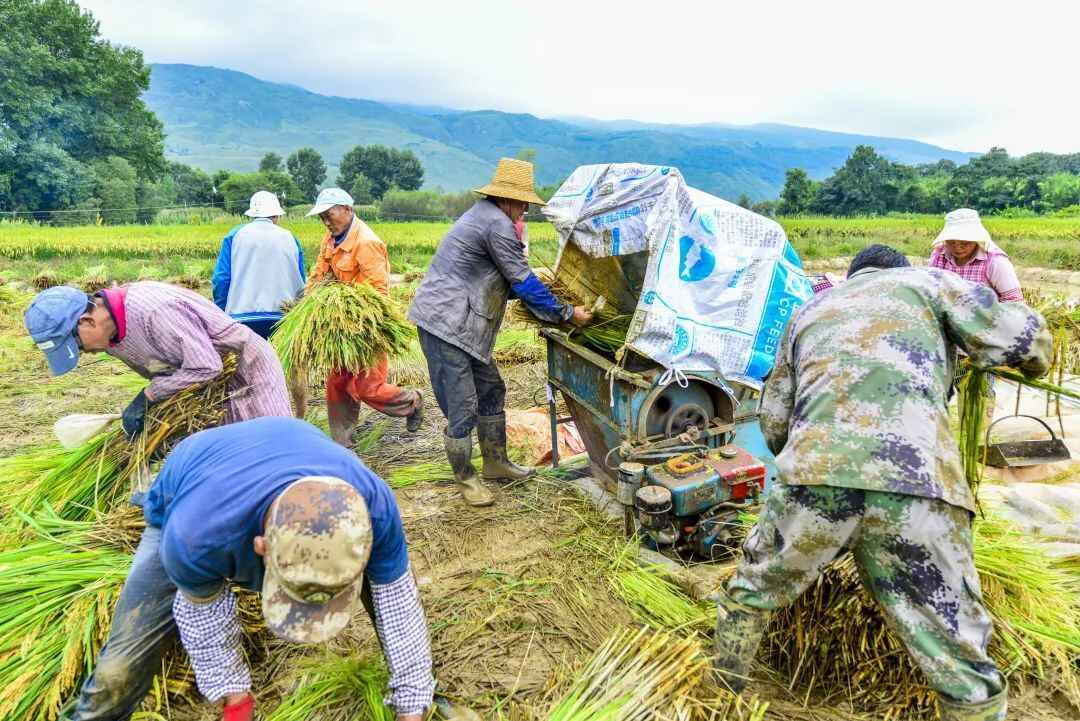 村民杨勋驾驶着小型水稻收割机来回穿梭在田间收割水稻,分外忙碌,稻农们头戴草帽,熟练挥舞着手中镰刀紧随其后,忙着装袋、捆绑、搬运……不一会儿,一块块稻田就被收割得干干净净。