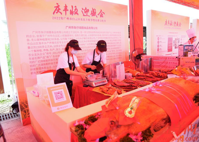 其中,朱仔烧腊展位上一米长的大烧猪最“吸睛”。“大烧猪红皮赤壮,寓意着一年的丰收,且吃起来皮脆肉滑,也是我们的特色。”朱仔烧腊创始人朱岳争表示,每年参加丰收节活动,对企业来说能起到较好的宣传效果。据悉,2017年朱仔烧腊的广式烧味制作技艺被白云区授予“区级非物质文化遗产”,2019年又被广州市授予“市级非物质文化遗产”。近年来,预制菜行业的兴起,让朱仔烧腊也迎来新的发展机遇。“我们日常主要对接大中院校和基层单位,具备推广预制菜的基础,随着普通市民对预制菜的接受程度也越来越高,我们正加大对预制菜加工产业的投入。”他说。