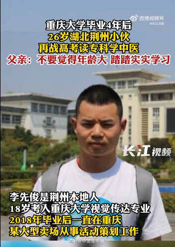 近日,今年26岁的李先俊入学后与18岁的新生们一起在操场上参加军训。从重庆大学毕业4年后,李先俊今年重新高考,以超本科线62分的成绩被湖北中医药高等专科学校中医学专业录取。(9月26日长江日报)
