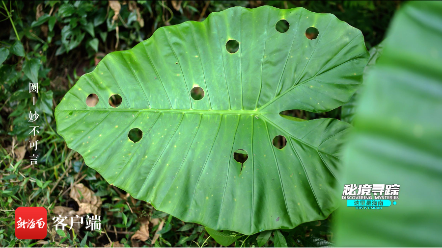 海芋的叶子上面被锚阿波莹叶甲吃成一个个圆圈。摄影:秘境寻踪摄制