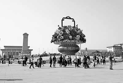 国庆节临近,“祝福祖国”巨型花果篮亮相天安门广场。 新华社发
