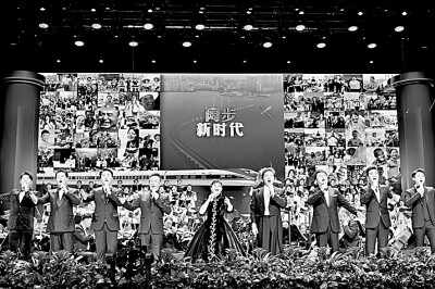 在日前举行的《阔步新时代》——殷秀梅和她的朋友们大型音乐会上,殷秀梅与数位知名歌唱家深情演绎《我和我的祖国》,带动全场大合唱。光明图片