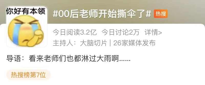 看到“00后老师开始撕伞了”这个热搜,大学学中文、从事幼儿教育工作的吕越也没看懂,“难道95后老师跟00后老师已经有这么大隔阂了?”