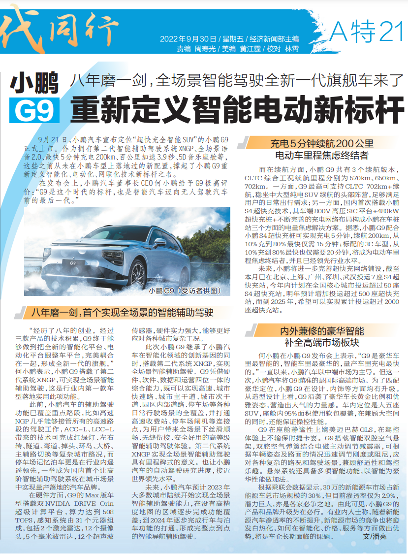 9月21日,小鹏汽车宣布定位“超快充全智能SUV”的小鹏G9正式上市。作为拥有第二代智能辅助驾驶系统XNGP、全场景语音2.0、最快5分钟充电200km、百公里加速3.9秒、5D音乐座舱等,这些之前从未在小鹏车型上落地过的新配置,撑起了小鹏G9重新定义智能化、电动化、网联化技术新标杆之名。