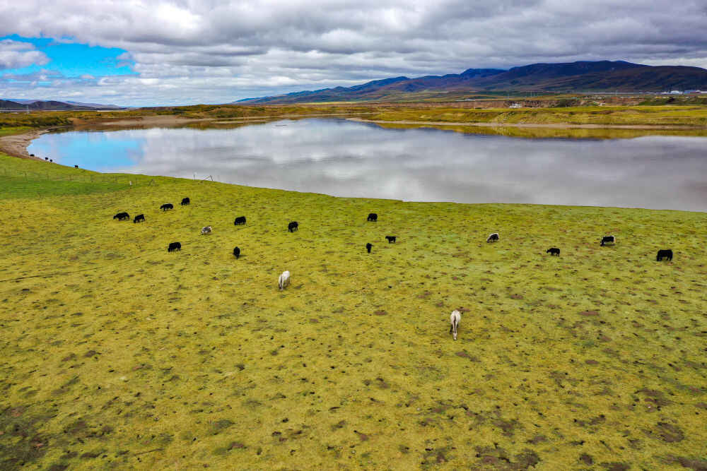 牛马在黄河干流玛曲段沿岸吃草(9月17日摄,无人机照片)。新华社记者郎兵兵 摄
