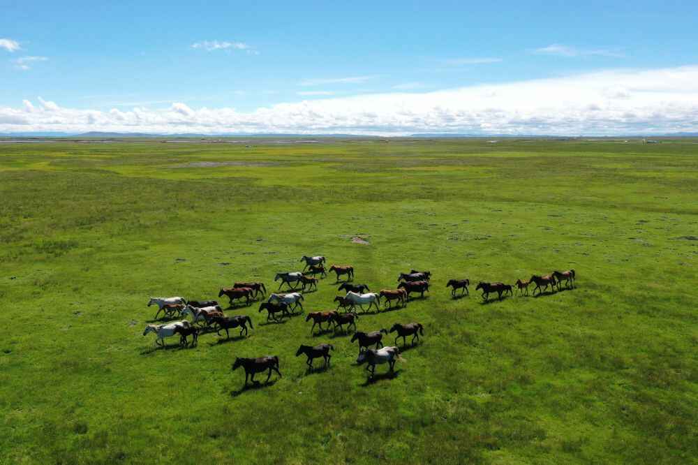这是在玛曲县河曲马场拍摄的河曲马(资料照片,无人机照片)。新华社记者杜哲宇 摄