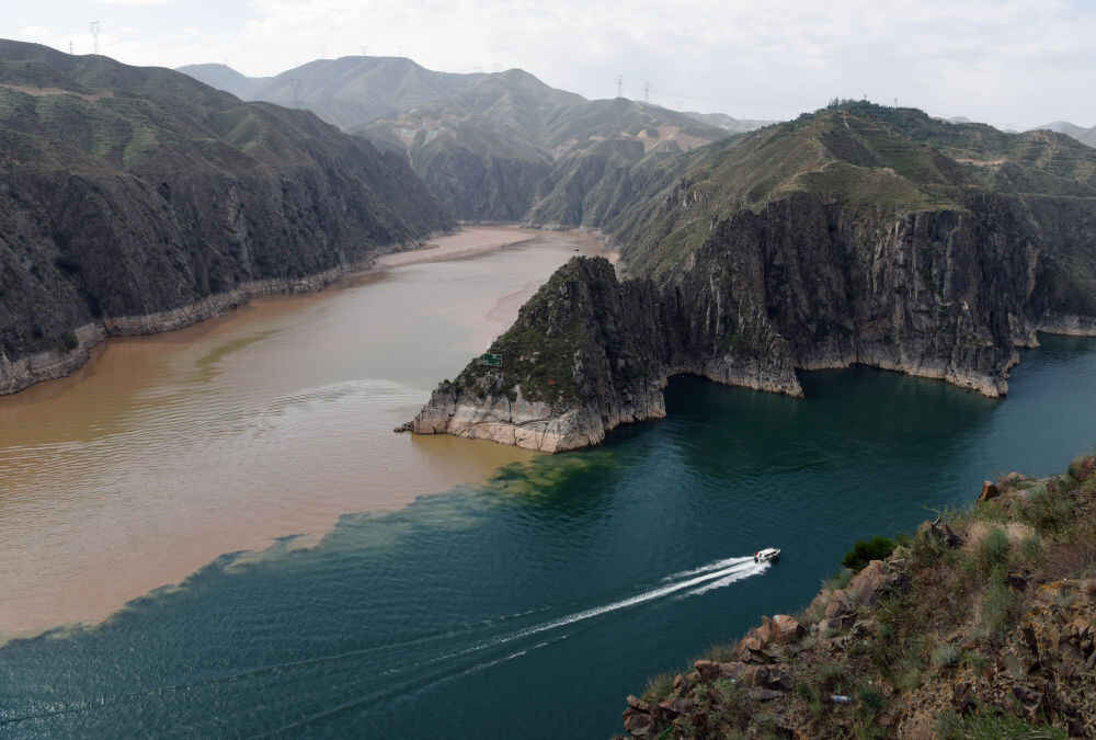沿河而下。在临夏回族自治州永靖县,青绿的黄河与裹挟着泥沙的洮河在峡谷间相撞,黄绿两色“泾渭分明”。