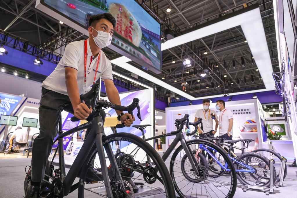 7月26日,参展商在消博会现场演示自行车产品。新华社记者 张丽芸 摄