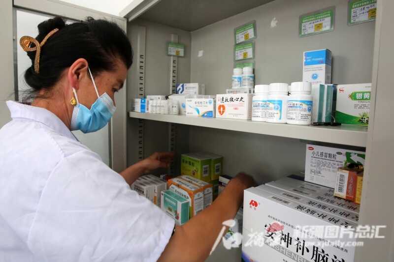 6月30日在伽师县江巴孜乡托万尕勒村卫生室,村医在整理药品。石榴云/新疆日报记者 蔡增乐摄