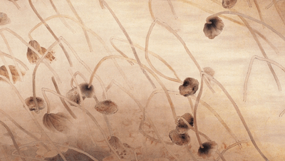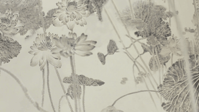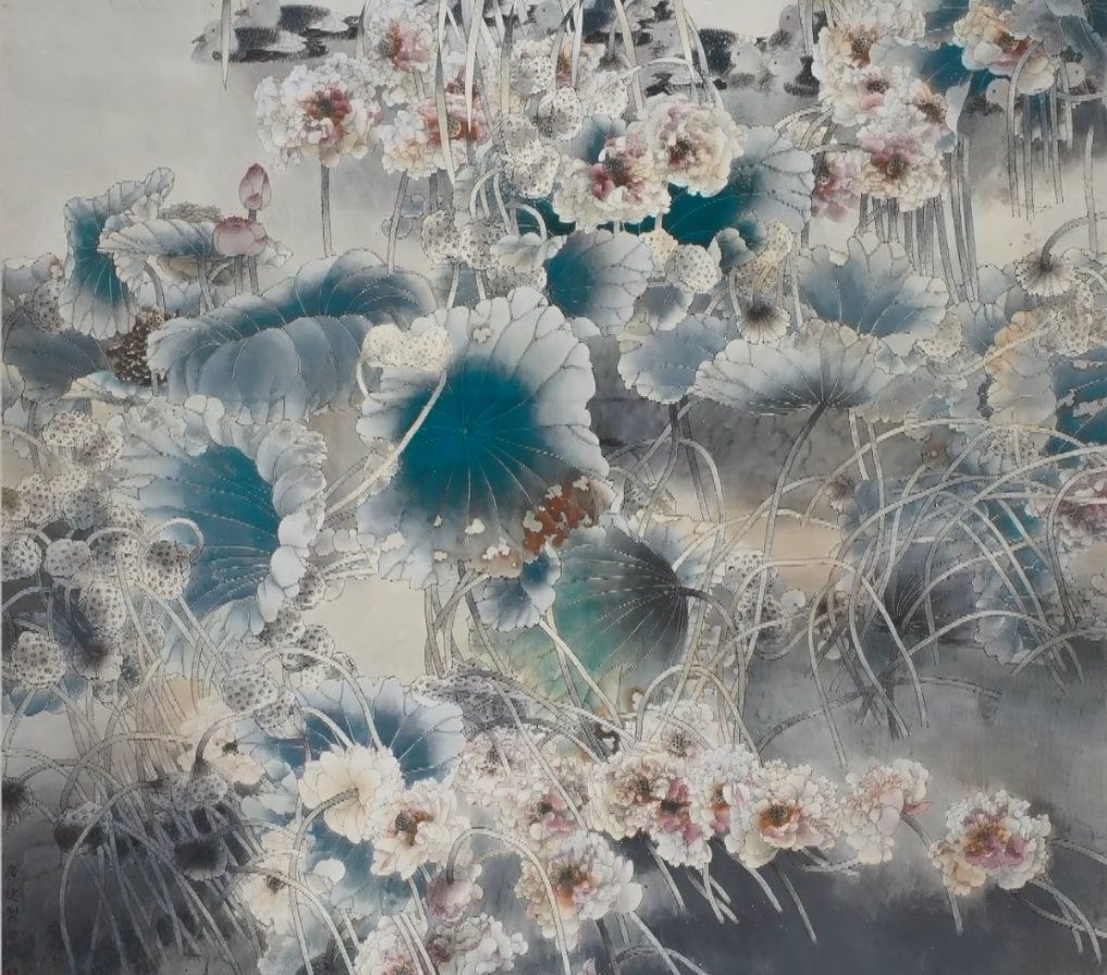 整幅作品最难的就是这些荷叶和这些荷(叶)梗线条的穿插、交织。荷叶实际上运用了没骨的技法,同时又融入了一些山水画的一些皴染的技法,而且是几次完成,这种方式实际上也是技法上的一个创新。