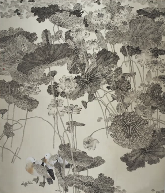 这幅作品(《寒塘幽韵》)是我最大的一幅没骨花鸟画,大概2米宽,2.2米高。它是运用一种水墨画的创作的思维方式,就是说我想到哪儿画到哪儿,这种灵感就是不期而遇,它不是理性的,它完全是感性的。