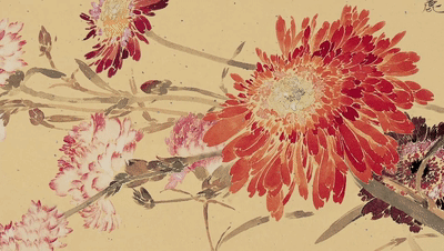 ”这幅作品是我比较典型的一幅没骨花卉的作品。这个花卉是在花店里买的几种花,把它组合起来。”