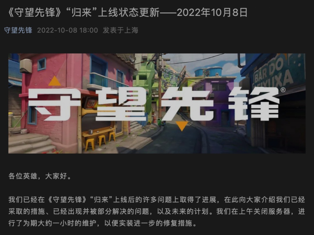 在10月6日和10月8日,守望先锋官方公众号也先后两次发布了《守望先锋》“归来”上线状态更新公告,并对短信安全保护、排队、服务器崩溃等问题做出回应和解释。可以想见,被这些局外因素折磨的部分玩家,对“归来”可不会有什么好脸色。