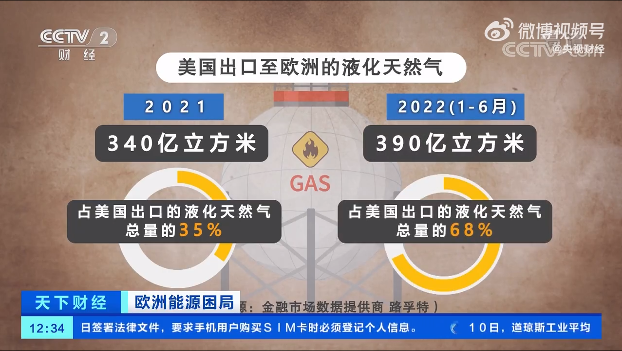 根据路透社援引金融市场数据提供商“路孚特”的数据,2022年1月至6月,美国向欧洲出口了390亿立方米液化天然气,占美国出口总量的68%。2022年的半年时间,美国出口到欧洲的液化天然气总量就超过了去年全年。