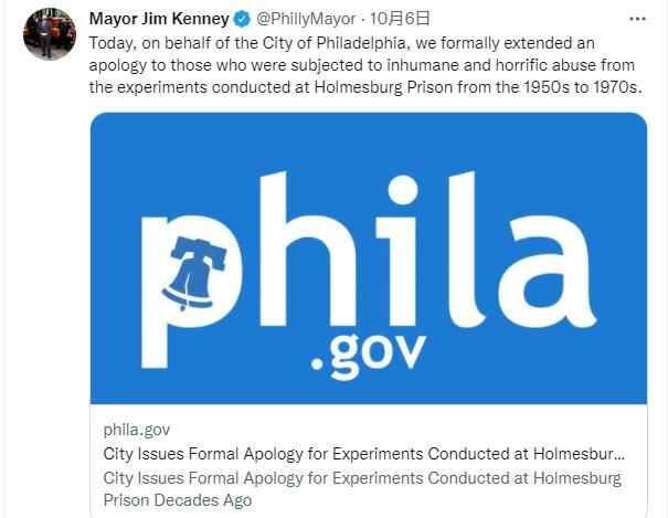 当地时间2022年10月6日,宾州费城市市长吉姆·肯尼在社交媒体上宣布,费城市政府发表声明,就霍姆斯伯格监狱的一系列“医学种族主义”实验,正式道歉。