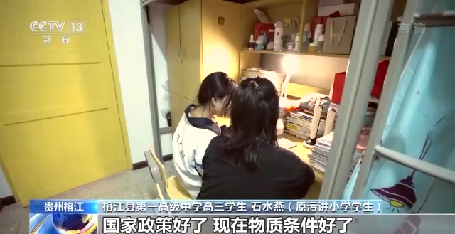 榕江县第一高级中学高三学生 石水燕(原污讲小学学生):国家政策好了,现在物质条件好了,衣服鞋子都够了。现在在县城这里,学校都提供热水,两个人一张桌子,一个人一个柜子,一个人一张床,挺方便的。
