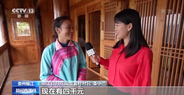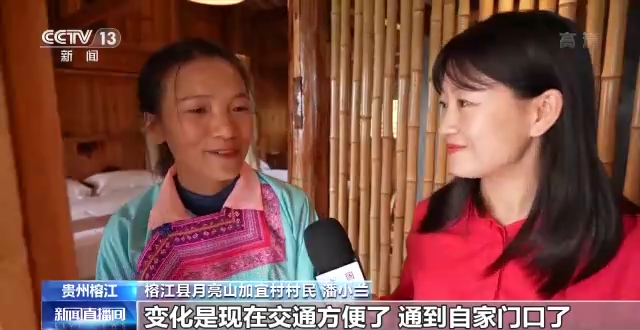 榕江县月亮山加宜村村民 潘小兰:变化是现在交通方便了,通到自家门口了。又开了月亮山居民宿,可以在这边工作,还可以照顾家里老人、小孩,现在非常满意。