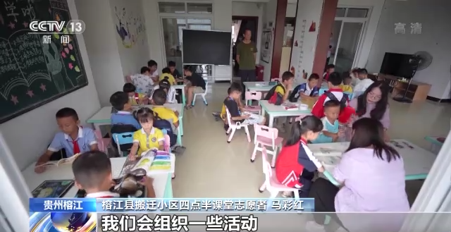 榕江县搬迁小区四点半课堂志愿者 马彩红:下午放学,他们到这边。写完课后作业之后,我们会组织一些活动,绘画、做手工之类的。