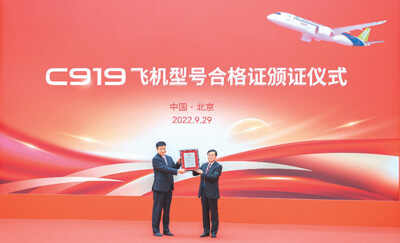 9月29日,C919飞机型号合格证颁证仪式在北京首都国际机场隆重举行,这是中国大飞机事业的重要里程碑,标志着中国按照国际通行适航标准研制、具有自主知识产权的大型客机通过适航审定。自此,中国拥有了一款可以投入航线运营的单通道干线客机。