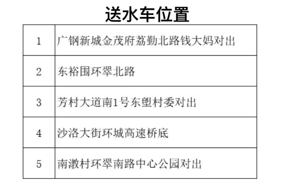 据悉,受施工影响,预计施工期间,芳村大道南沿线,广钢新城金茂府以东、鹤洞桥以南,东沙街南漖村、沙洛村、东塱村等区域的供水压力可能出现波动。为减少施工对上述区域供水的影响,广州市自来水有限公司将通过优化供水调度,把供水影响降至最低;并设置5辆应急送水车,在受影响区域提供临时用水服务。
