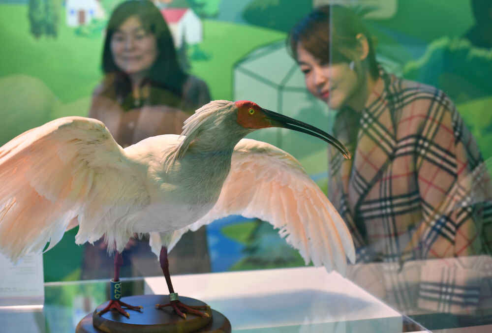 ↑游客在陕西宁陕朱鹮野化放飞基地管理站内参观(10月10日摄)。
