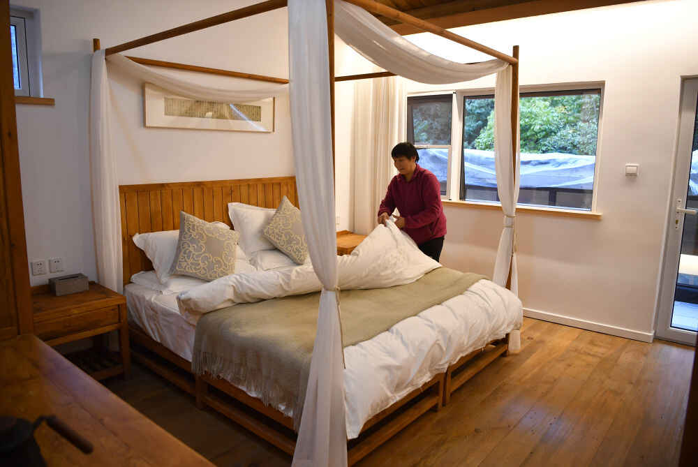 ↑在宁陕县广货街镇沙沟村由闲置破旧农房改造而成的民宿中,村民张胜霞在整理卧室床铺(10月9日摄)。