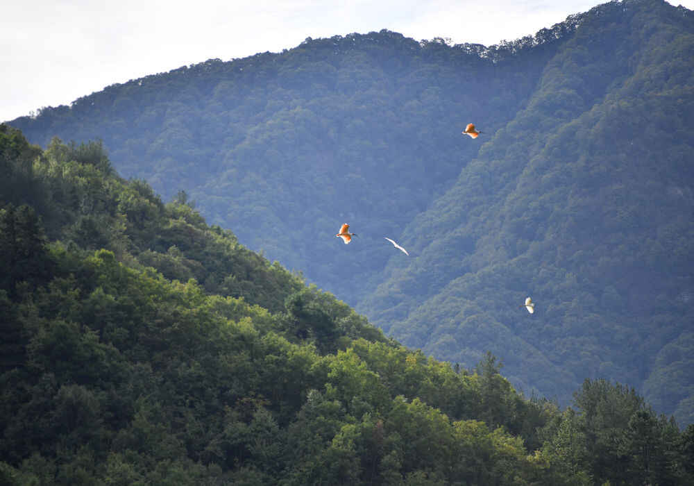 ↑宁陕县城关镇寨沟村,朱鹮在天空中翱翔(10月10日摄)。