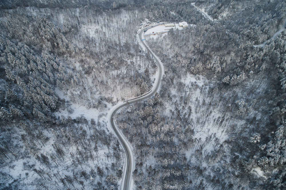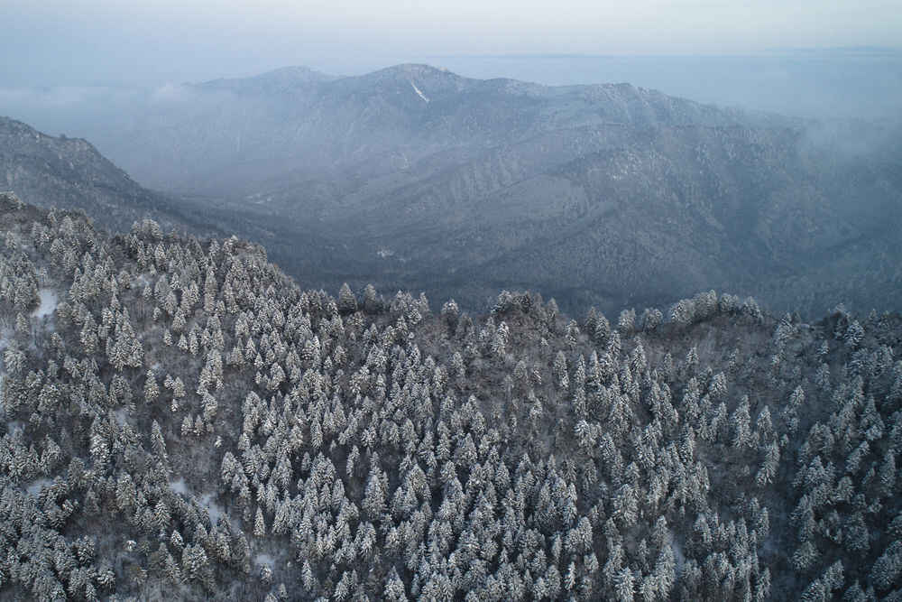↑宁陕县境内实施天保工程后的秦岭平河梁景色(2月7日摄,无人机照片)。