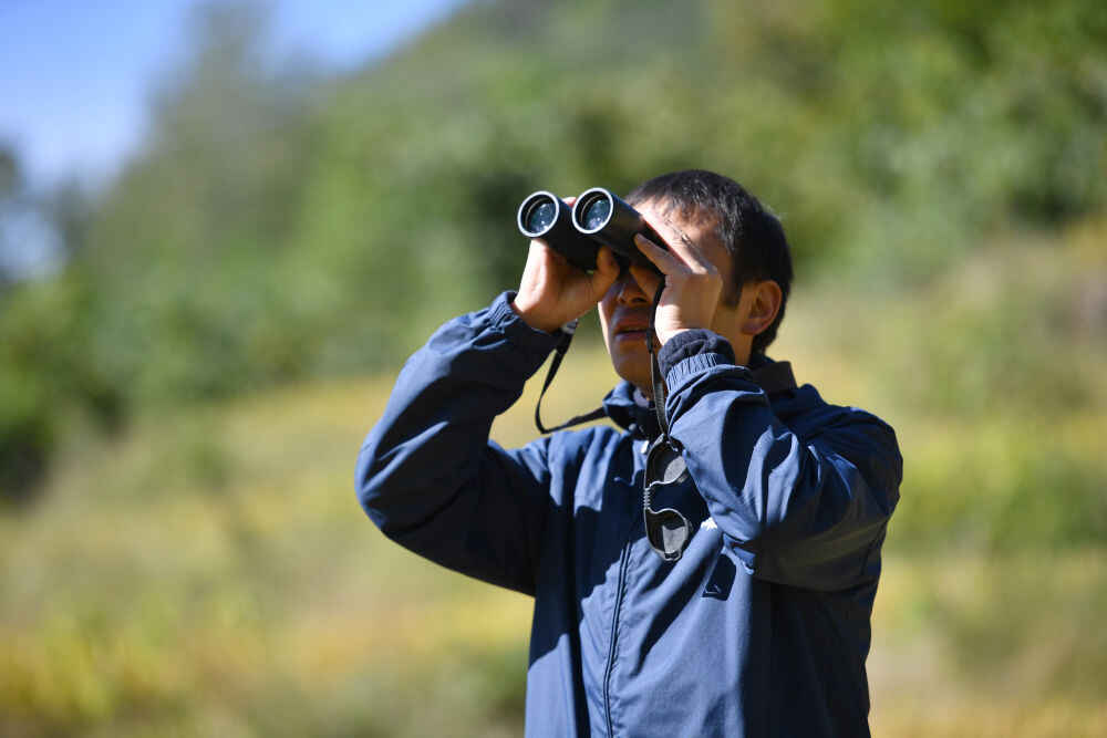 ↑陕西宁陕朱鹮野化放飞基地管理站站长李夏在观察朱鹮的日常状况(10月10日摄)。
