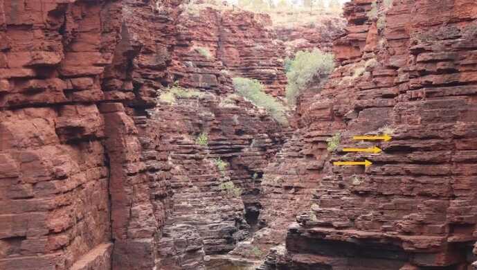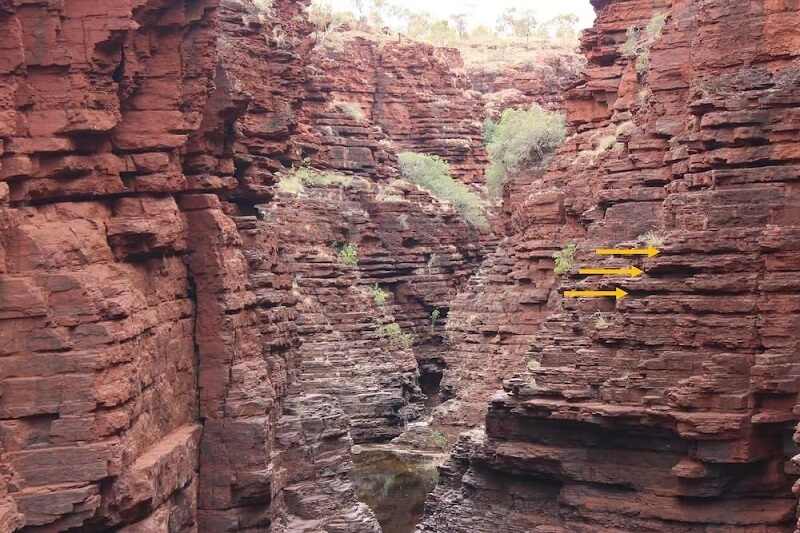 在澳大利亚卡里吉尼国家公园,一些峡谷中有着25亿年前的分层沉积物。这些沉积物由独特的铁层和富硅矿物组成,曾经广泛沉积在海底,现在在地壳最古老的部分发现。如乔弗瑞瀑布悬崖,就显示出红棕色铁层与更暗条层错落相间的纹理。
