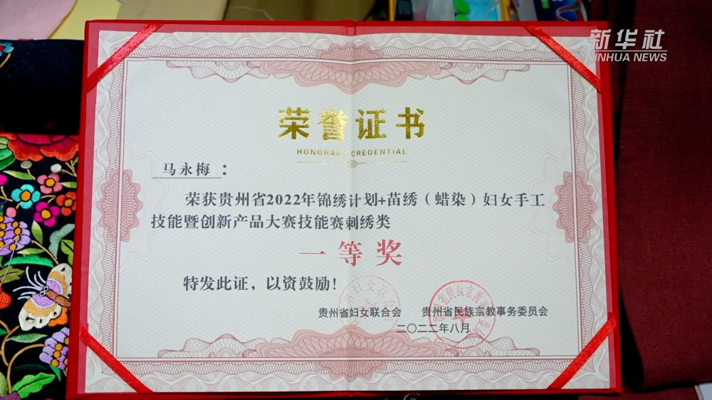 当地的苗族绣娘马永梅因技艺精湛在全省刺绣舞台上脱颖而出。她的布贴绣技艺获得了认可,也让她更加坚定地将文化传承坚守下去,让更多的人认识并喜爱这项传统民族技艺。