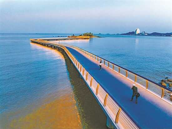 海天驿站景观栈道整体呈“Z”字形,栈道上部采用抗扭刚度大、跨越能力强、安全系数较高的现浇梁结构,下部采用受力性能好、稳健结实的圆柱墩,可以有效抵御台风及海浪,整体结构轻盈、造型美观,与周围景观相得益彰。