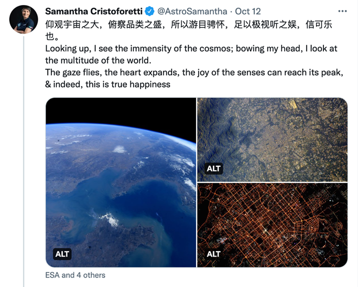 克里斯托福雷蒂12日在她的推特账号上发布了这句中国人耳熟能详的古文,并附上了英语和意大利语译文,以及拍摄自空间站的渤海湾和北京市的照片。