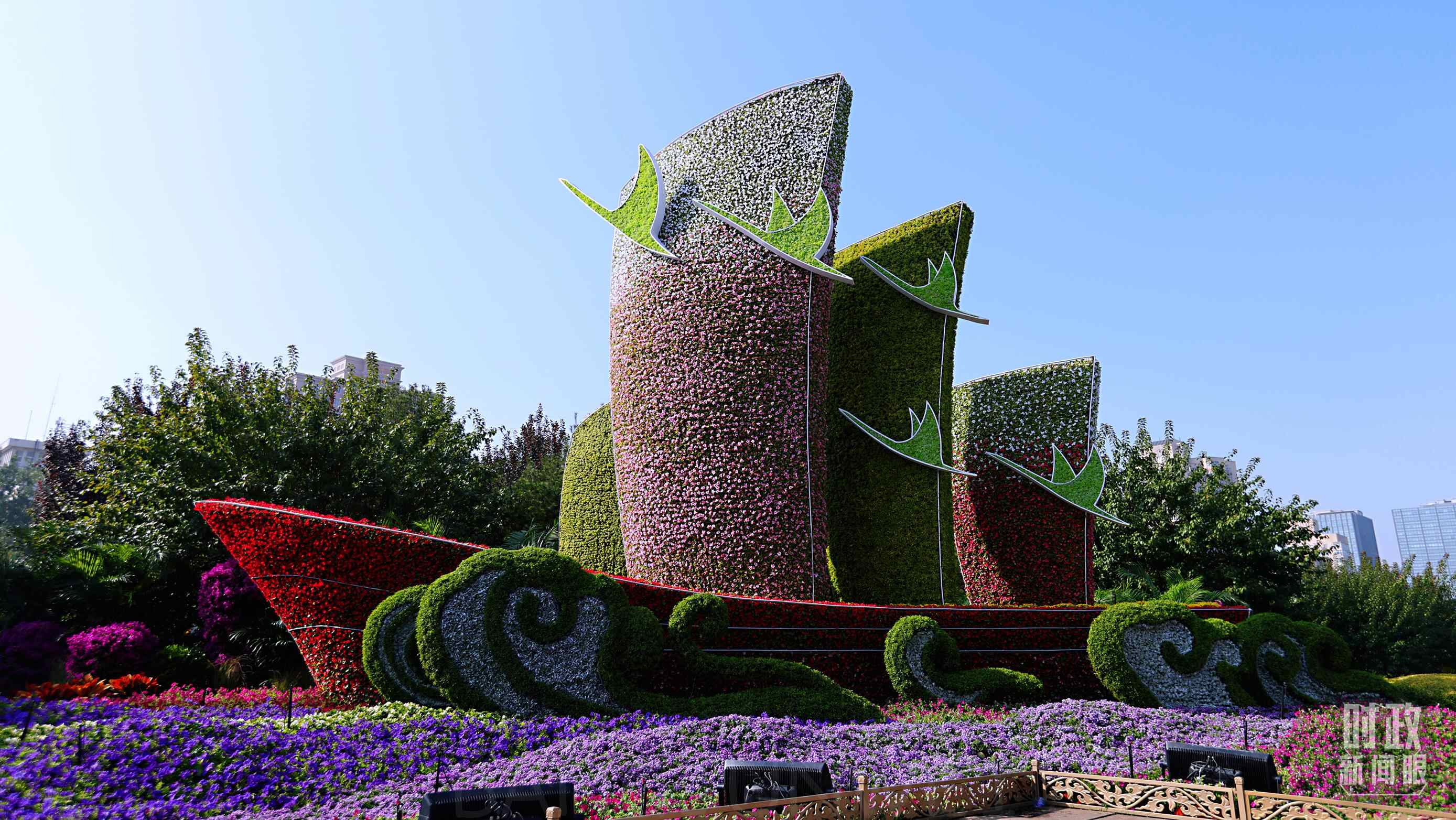 △北京长安街沿线的“伟大复兴”主题花坛。(总台央视记者魏帮军拍摄)