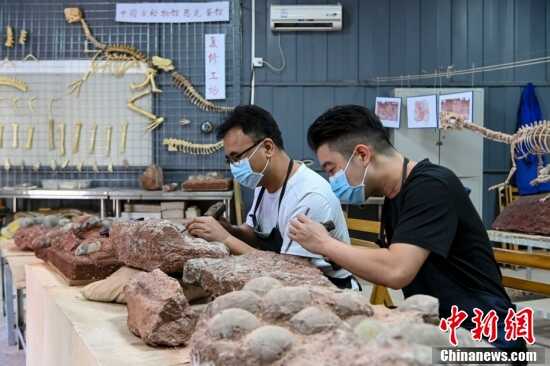 工作人员在中国古动物馆恐龙蛋馆修复工厂内修复恐龙蛋化石。