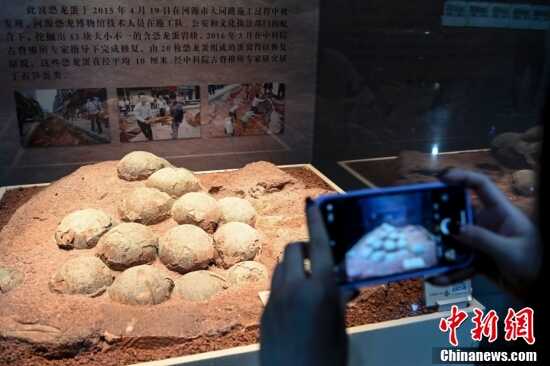恐龙博物馆馆藏内的恐龙蛋化石吸引游客拍照。