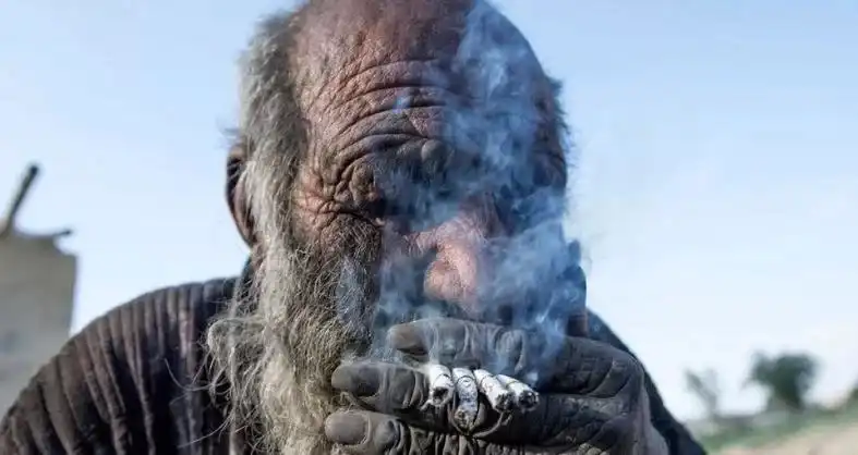 村民们说,哈吉也是个可怜人,“年轻时曾经历过情感挫折”,这导致他拒绝用水洗手。平日里,他时常会用布满动物粪便的烟斗吸烟,并认为清洁会让他生病。照片显示,他一次会同时抽上好几根烟。