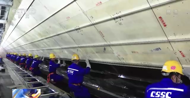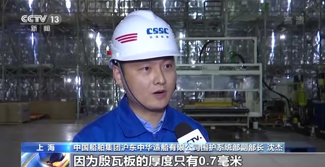 中国船舶集团沪东中华造船有限公司围护系统部副部长 沈杰:焊接难度非常大,因为殷瓦板的厚度只有0.7毫米,就相当于我们一些硬纸板的厚度,稍不小心就会把钢板焊穿掉。