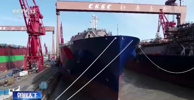 这里是上海造船基地,大家看到的这艘船是中国船舶沪东中华船厂刚刚交付的一艘17.4万方的LNG船,这艘船是中远海运、中石油国事LNG运输项目6艘系列船中的首制船。