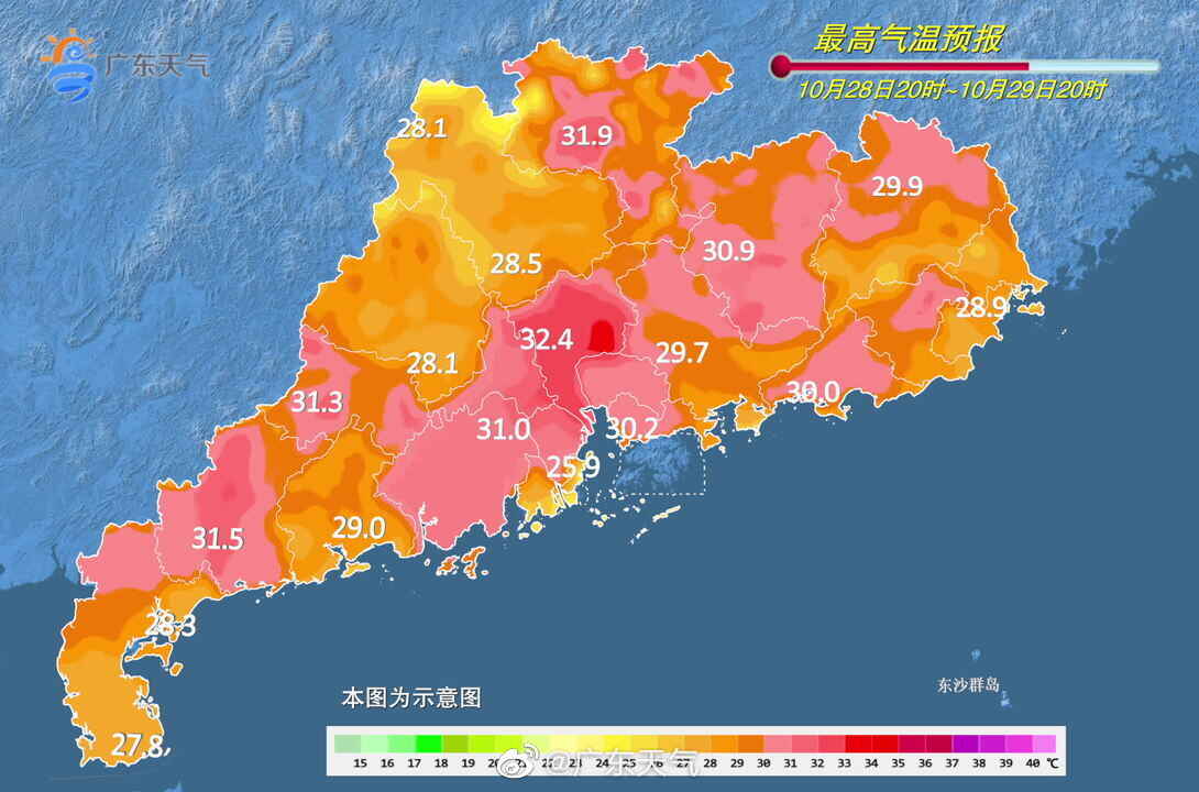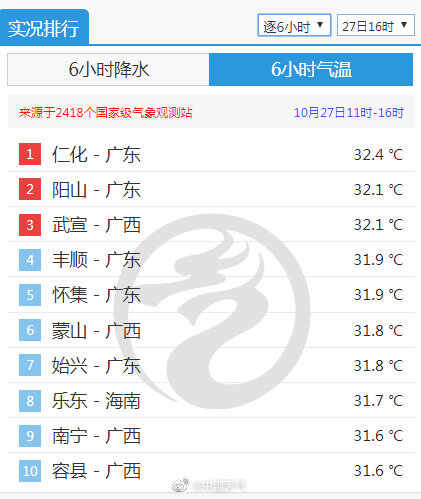 27日,华南三兄弟毫不意外地再度携手登上全国气温前十榜单,广东的仁化、阳山更是以32°C+的高温勇夺冠亚军,广东毫无遮掩地感受了快到11月太阳的威力。