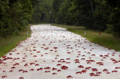 近日,澳大利亚圣诞岛的红蟹到了一年一度的迁徙季节,成千上万只红蟹从森林出发,奔向海岸交配产卵。目前,沿途的道路、桥梁上已经开始出现大量红蟹,密密麻麻如同一支红色大军。到达海岸后,雄蟹会先去挖洞,随后雌蟹进入交配产卵,产卵结束后再返回森林。