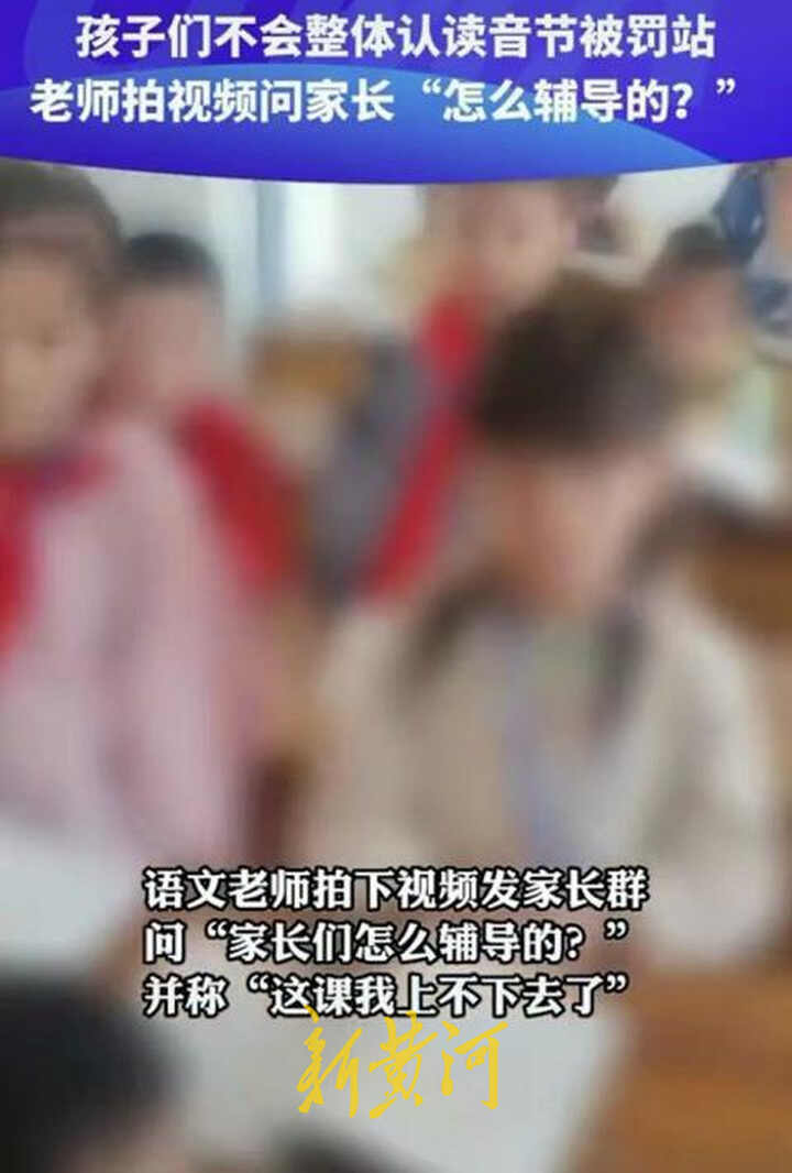 根据网友上传的视频显示,10月26日,在一所小学一年级的课堂上,大多数孩子因为不会整体认读音节,被老师罚站。随后,老师还录了一段视频发到家长群中,生气地质问家长:“让你们家长看看啊,这么多人,什么是整体认读音节都不知道,整体认读音节给我读bopomofo,家长们怎么在教?怎么在辅导?我上不下去了这个课。”记者了解到,涉事学校为江西省吉安市新干县善政小学。