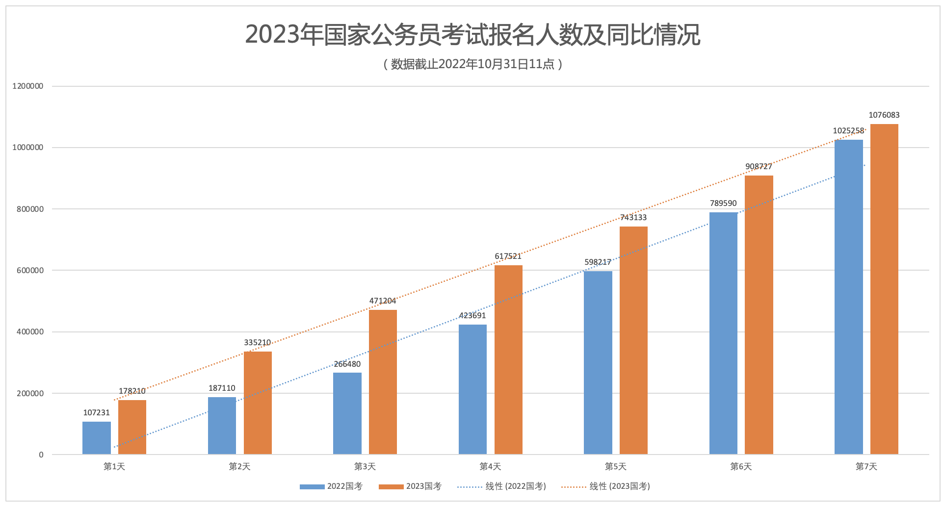 10月31日,2023年国考报名第七日,截至当天11时,总报名人数已突破100万,较前一日增长了167356人,总体比去年同期增长了50825人。