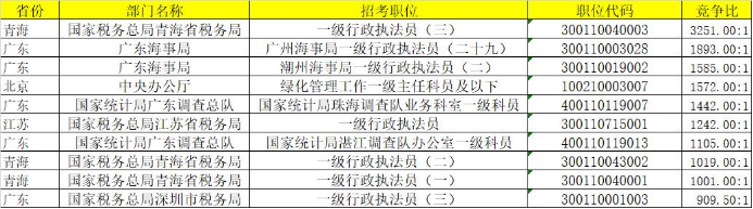 截至报名第六日17时,竞争最激烈的前十大岗位基本稳定,一直保持很高热度,过审平均竞争比已达1500:1。竞争最激烈的岗位已经达到3251:1,该岗位是位于青海省玉树藏族自治州曲麻莱县的国家税务总局青海省税务局的岗位,从事税(费)征收管理和服务工作。