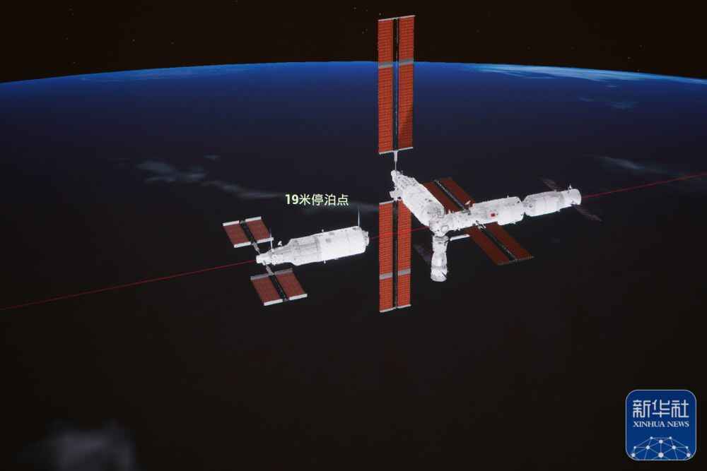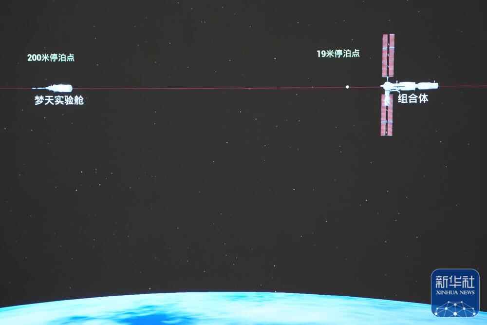 11月1日在北京航天飞行控制中心拍摄的空间站梦天实验舱与空间站组合体在轨完成交会对接。这是梦天实验舱从200米停泊点向19米停泊点靠近的模拟图像。新华社发(孙丰晓 摄)