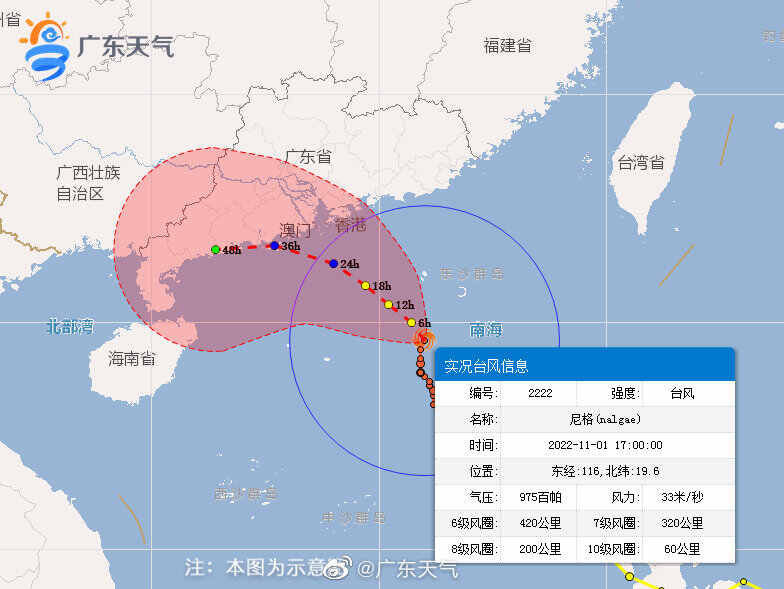 根据中央气象台观测,11月1日22时,“尼格”中心距离广东省阳江市东偏南方向约465公里,中心附近最大风力11级,已减弱至强热带风暴级。