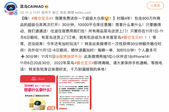 最终由菜鸟带搬仓宝贝到天猫超市仓库(杭州萧山)任意搬选商品,奖品后续也将由菜鸟提供送货上门服务。