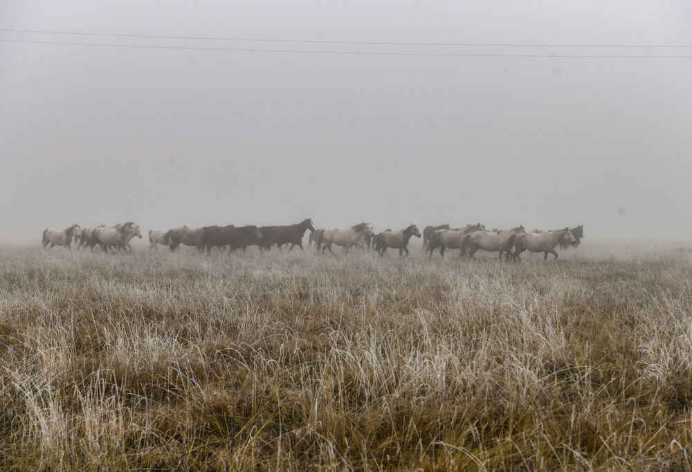这是10月18日在四川省阿坝藏族羌族自治州若尔盖县唐克镇拍摄的晨雾中的河曲马群。新华社记者 王曦 摄