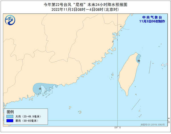 据中国天气网消息,今天(11月3日)4时50分前后,今年第22号台风“尼格”减弱后的热带低压在广东珠海香洲区登陆。受其和冷空气共同影响,广东中部沿海、台湾岛东北部的部分地区将有大到暴雨,福建沿海、台湾岛沿海、广东中东部沿海等海域有大风。